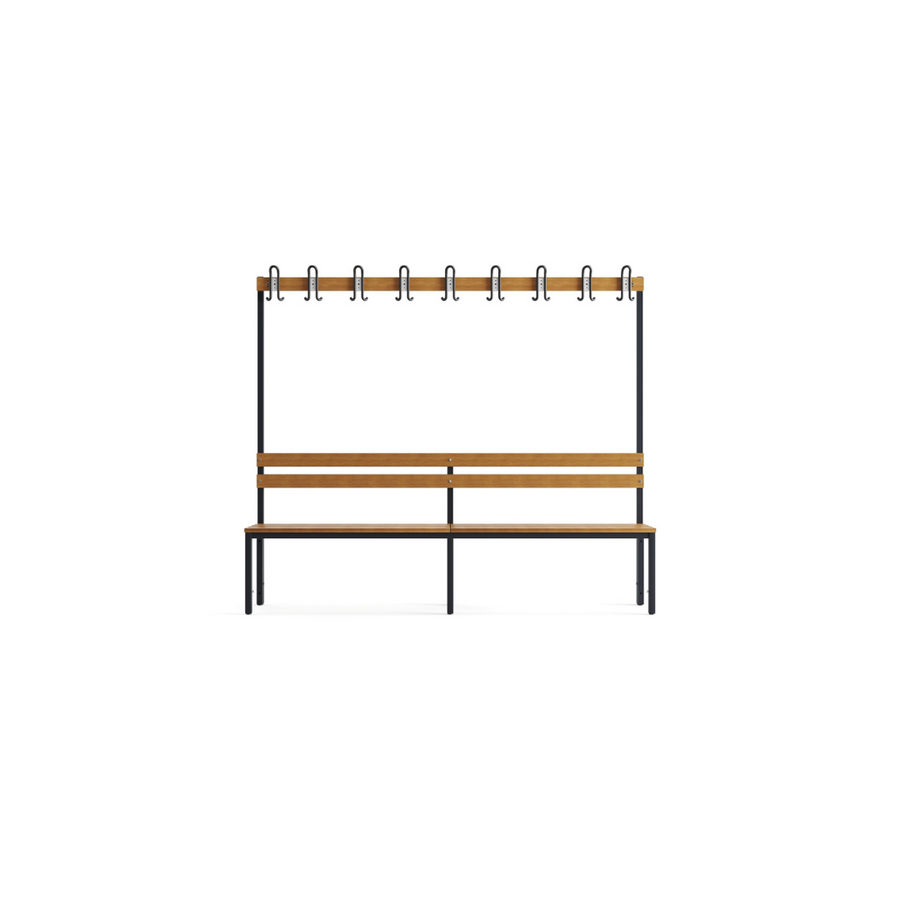 Furni24 Einseitige Umkleidesitzbank 200x43x170 cm mit 6 Füßen ohne Schuhrost, Garderobe mit lackierter Hartholz-Sitzbank und Stahlrahmen, Umkleidebank mit Hakenleiste, 9 Haken, TÜV/GS getestet