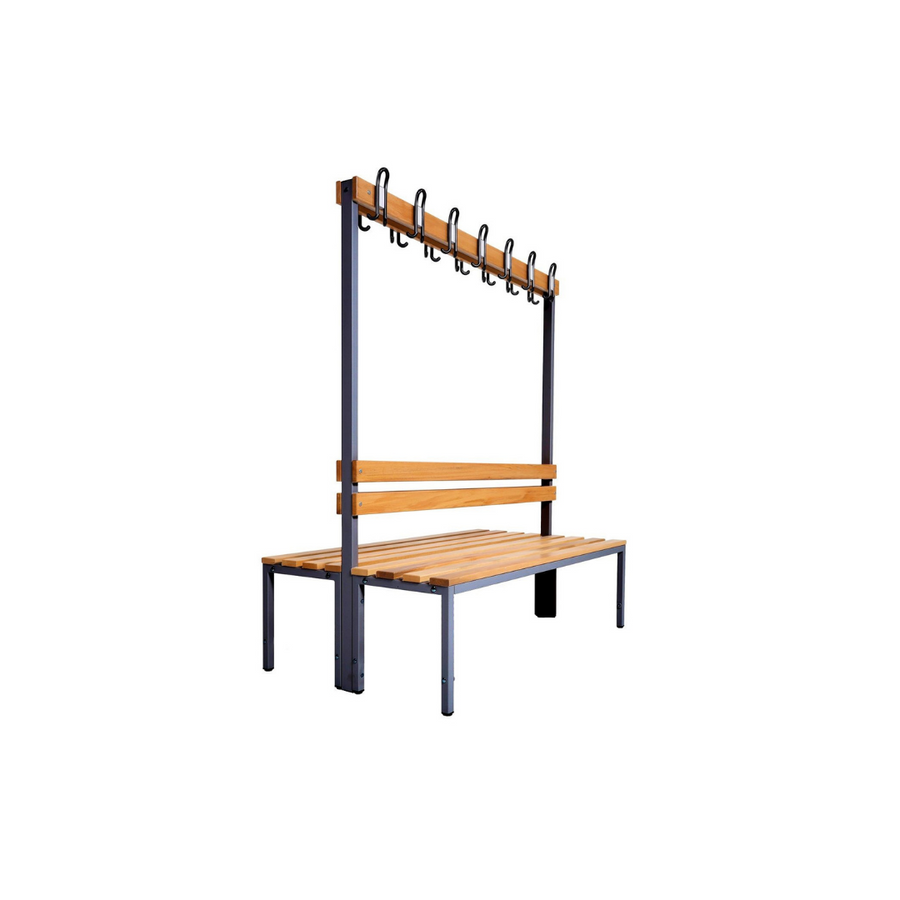 Furni24 Doppelseitige Umkleidesitzbank 150x43x170 cm mit 4 Füßen ohne Schuhrost, Garderobe mit lackierter Hartholz-Sitzbank und Stahlrahmen, Umkleidebank mit Hakenleiste, 14 Haken, TÜV/GS getestet